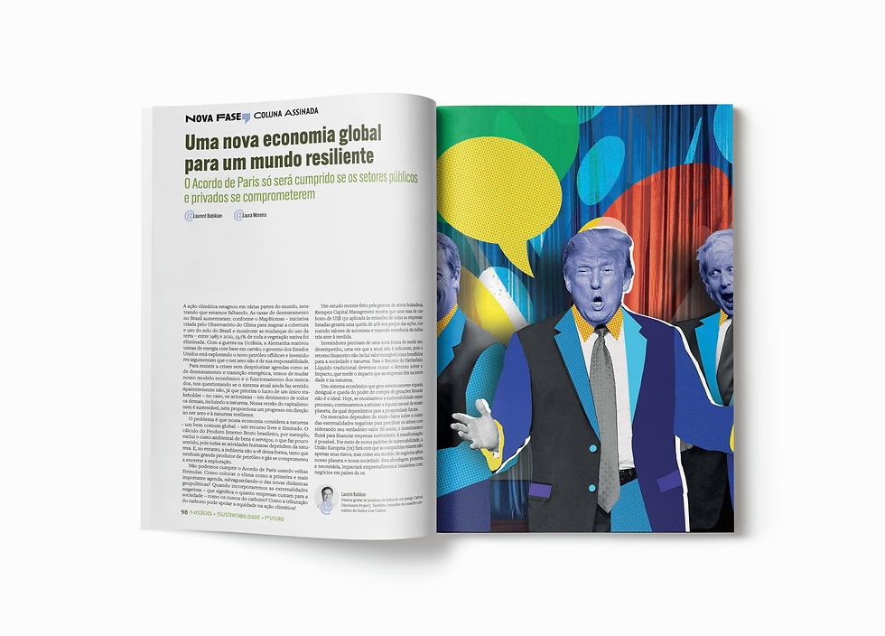 A fim de atrair leitores para uma pauta atual e importante, nossa linguagem proporcionava uma visão descontraída, mas de credibilidade ao tema. Utilizamos a colagem, junto às letras da palavra SUSTENTABILIDADE, uma paleta de cores atrativa e uma linguagem fotográfica forte.